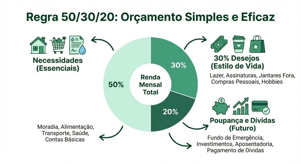 Essencialmente, a regra 50 30 20 é um método de orçamento que divide sua renda mensal em três categorias claras: